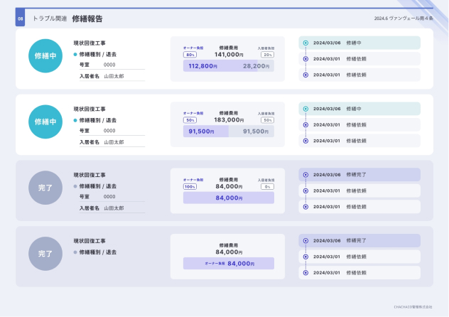 物件に紐付く修繕情報を全て管理出来ます。費用の精算の他、オーナーへの確認や修繕履歴の出力など、一連の業務を一つのフローで実行できます。