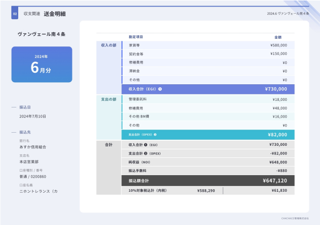各月のオーナー報告と送金明細を、ワンクリックで自動作成する機能があります。日々の業務を適正に行っていることで、月末の業務を大幅に簡略化することができます。