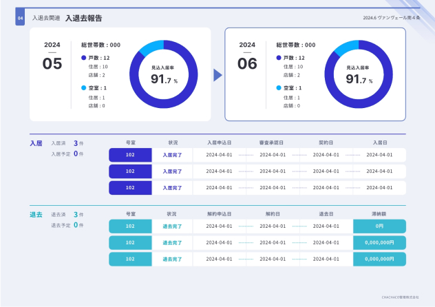 契約から入居までの全ての工程を一つのフローで管理出来ます。アラート機能と連動して、次にやるべきことがスケジュールされるので、抜けもれなく業務を行うことができます。